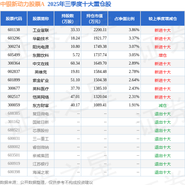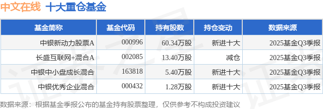 根据2025基金Q3季报公募基金重仓股数据,重仓该股的公募基金共4家,其中持有数量最多的公募基金为中银基金的中银新动力股票A。中银新动力股票A目前规模为5.7亿元,最新净值0.898(10月30日),较上一交易日下跌1.32%,近一年上涨16.47%。该公募基金现任基金经理为王伟然。王伟然在任的基金产品包括:中银中小盘成长混合,管理时间为2020年11月2日至今,期间收益率为3.93%;中银优秀企业混合,管理时间为2021年6月22日至今,期间收益率为-13.93%;