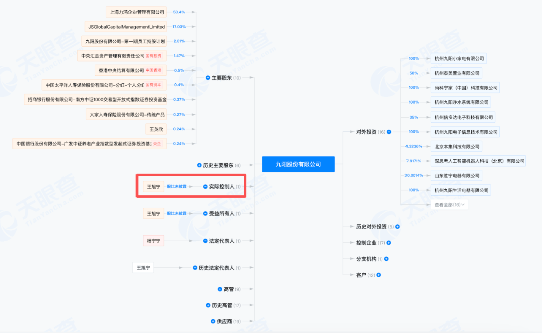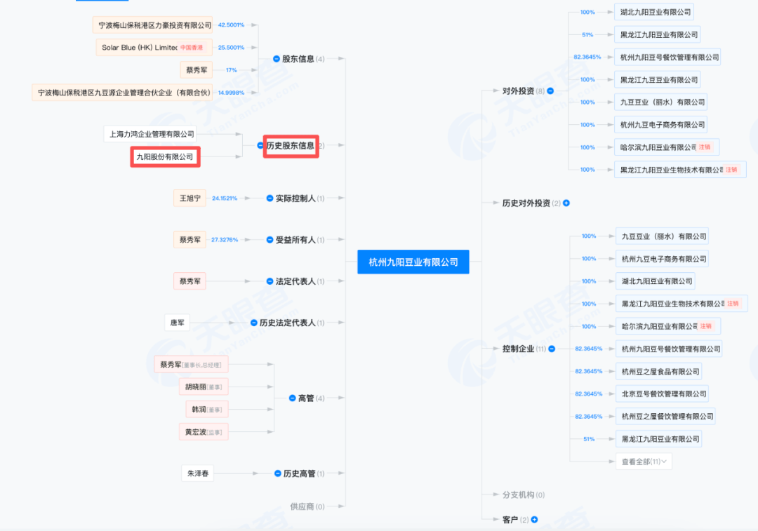当时九阳股份表示彻底退出豆浆食品业务,以集中资源聚焦小家电主业。此后,九阳股份正式退出九阳豆业股东行列,两家公司在资本与经营层面已完全独立。虽然天眼查关系图谱显示,九阳股份副董事长、董事韩润目前仍担任九阳豆业董事,但股权关系已彻底剥离。九阳股份成立于2002年,主要从事家电研发、制造与销售,而九阳豆业成立于2008年,股东已变更为宁波梅山保税港区力豪投资有限公司等机构。