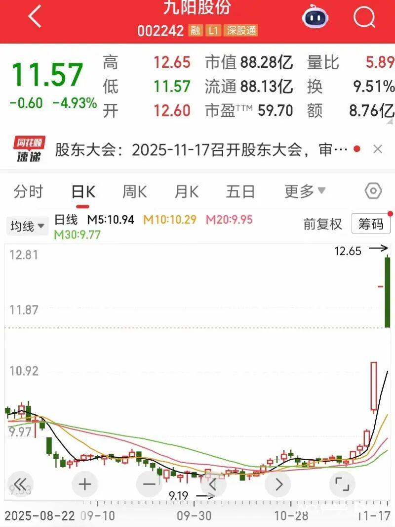 2025-11-19股票推荐,今日牛股,短线股票推荐,明日股票推荐,热门板块分析/每日精选A股潜力牛股,覆盖短线爆发股与长线价值股,附技术图形、资金动向与题材热点分析,助您提前抓住风口,精准进场!就因为“哈基米”三个字,九阳豆业新品“哈基米南北绿豆浆”卖爆了。受此影响,九阳股份股价直线日,九阳股份发布股票交易异常波动公告,针对近期“哈基米” 概念相关市场热度作出澄清。公司明确表示,自身及下属子公司均不涉及食品、饮料类产品的研发、生产与销售。未来,公司也将继续聚焦深耕小家电行业。公司提醒广大投资者注意投资风险,理性投资。而受此影响,近日受到股民热捧的“豆浆概念股”九阳股份开始下跌,截至11月17日收盘时,九阳股份股价下跌4.93%,现股价为11.57元。
