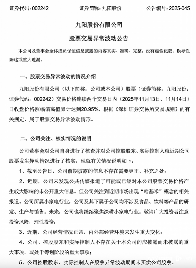 对于股价连续涨停,南都湾财社记者注意到,九阳股份曾多次澄清:13日午间,九阳股份在互动平台表示,公司没有哈基米hachimi相关的产品。公司主营业务及产品聚焦于厨房小家电领域,公司及其下属公司均不涉及食品、饮品类产品。