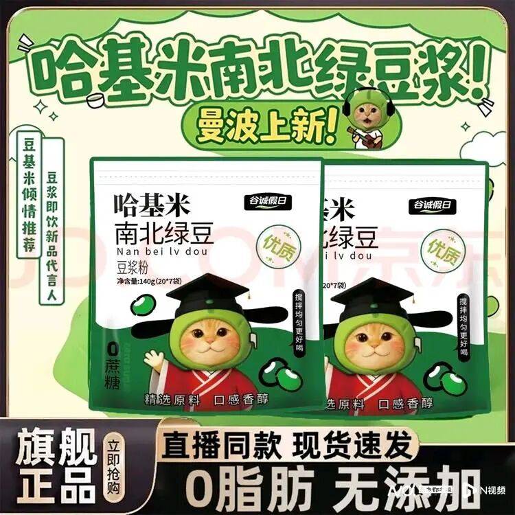 近期,一款名为“哈基米南北绿豆浆”的产品走红网络,产品外观上清楚地标明“九阳豆浆”字样,生产企业名称为杭州九阳豆业有限公司(下称“九阳豆业”)。这款新品紧紧抓住了年轻人的消费心理,以“0脂肪、无乳糖”的健康牌和“哈基米吸引力爆表”的情感牌作为核心卖点。产品包装上印有风靡网络的猫meme表情包,一经上架便迅速出圈,成为市场热议的焦点。