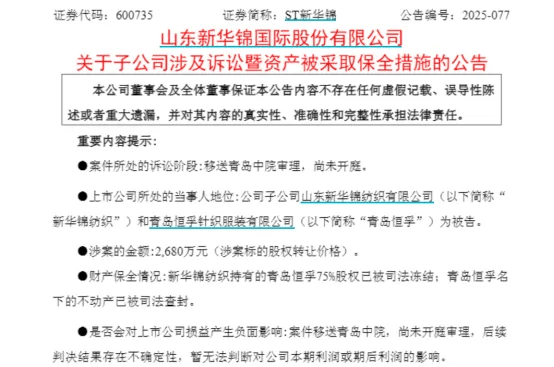 目前,新华锦纺织持有的青岛恒孚75%股权及香港华泰实业持有的25%股权已被司法冻结,同时青岛恒孚名下的不动产也被司法查封。公司表示将积极应诉,维护自身权益,并关注案件进展,及时履行信息披露义务。