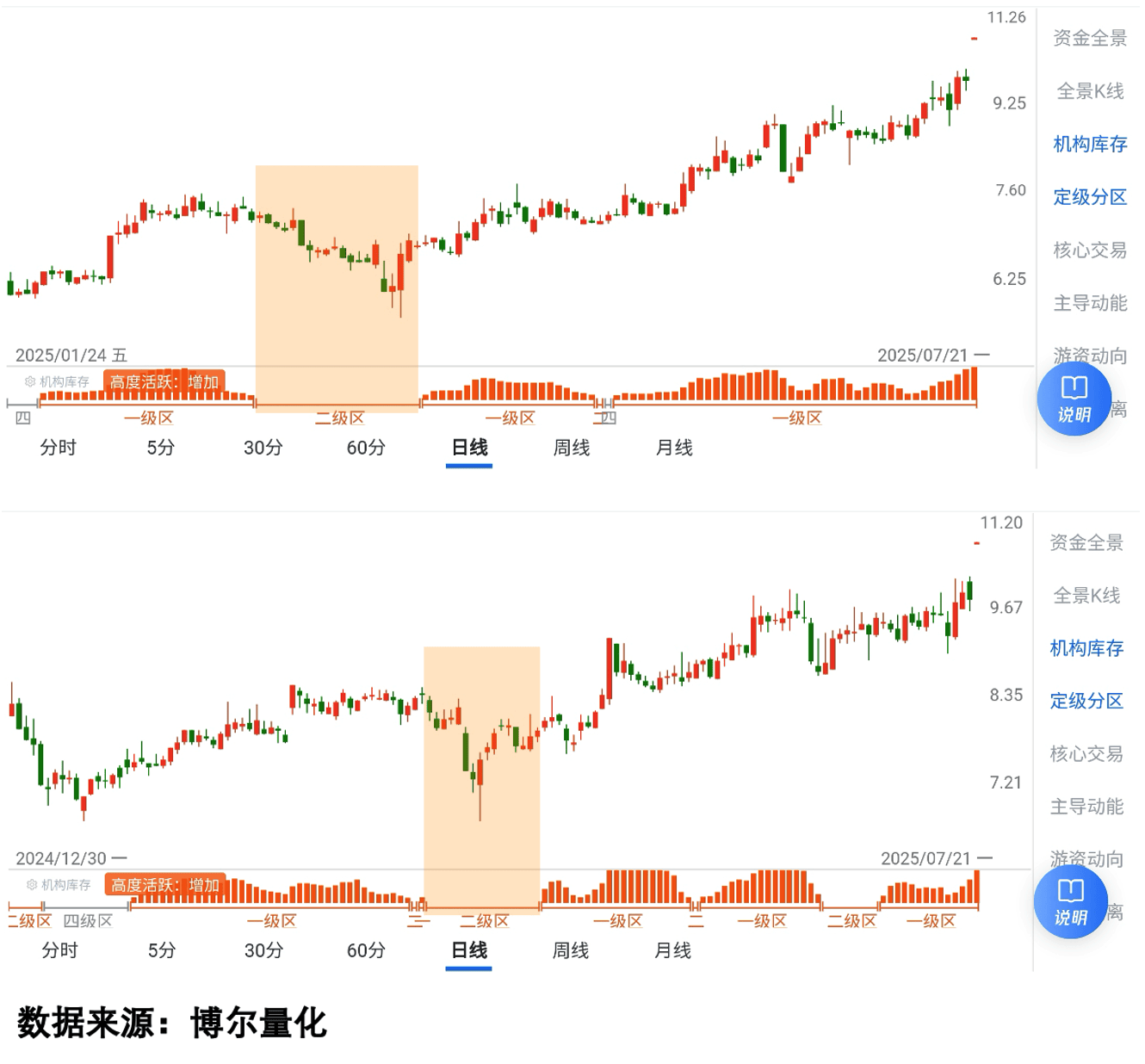 要精准识别资金的参与状态,「定级分区」数据是非常实用的量化工具,它把机构资金的活跃程度分成不同区域,数字越小,代表机构资金的活跃程度越高,其中「一级区」「二级区」代表机构行为活跃,「三级区」「四级区」则代表机构几乎没有积极参与交易。看图2: