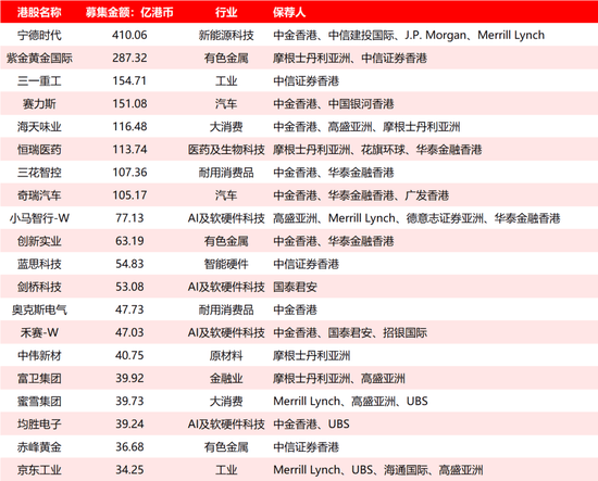 让我们先看看2025年港股IPO募集金额前二十名上市公司榜:宁德时代、紫金黄金国际、三一重工排名前三,行业主要以新能源科技,AI及软硬件科技,医药及生物科技,有色金属,大消费为主。